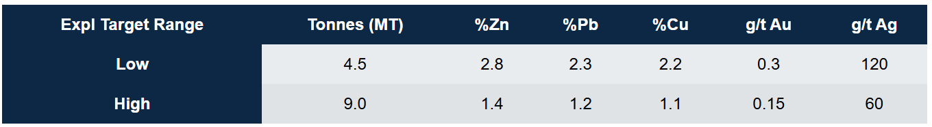 | Expl Target Range | Tonnes (MT) | %Zn | %Pb | %Cu | g/t Au | g/t Ag |
