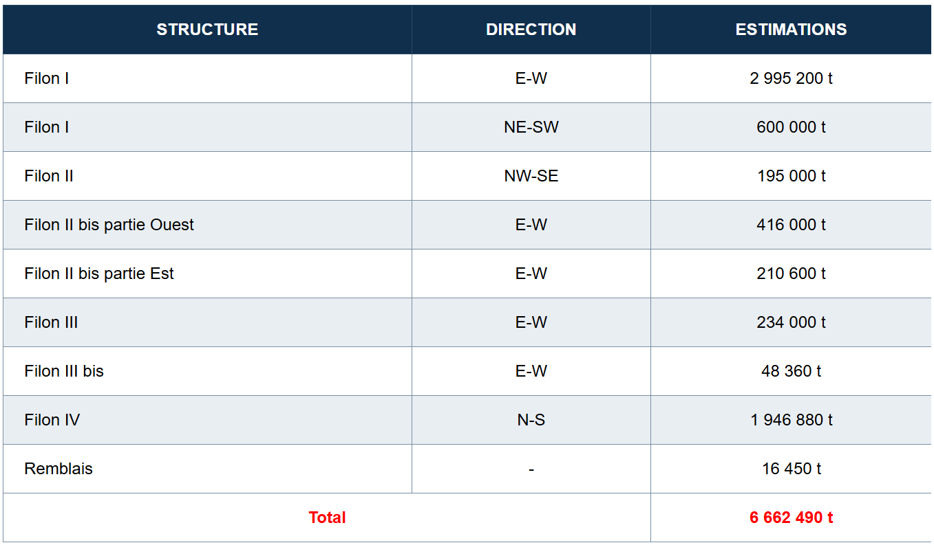 | Filon II bis partie Ouest | E-W | 416 000 t |