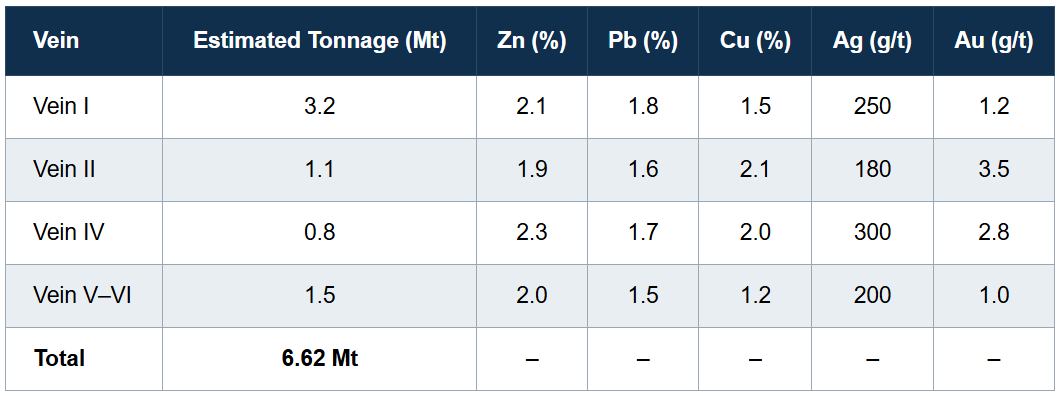 | Vein | Estimated Tonnage (Mt) | Zn (%) | Pb (%) | Cu (%) | Ag (g/t) | Au (g/t) |
